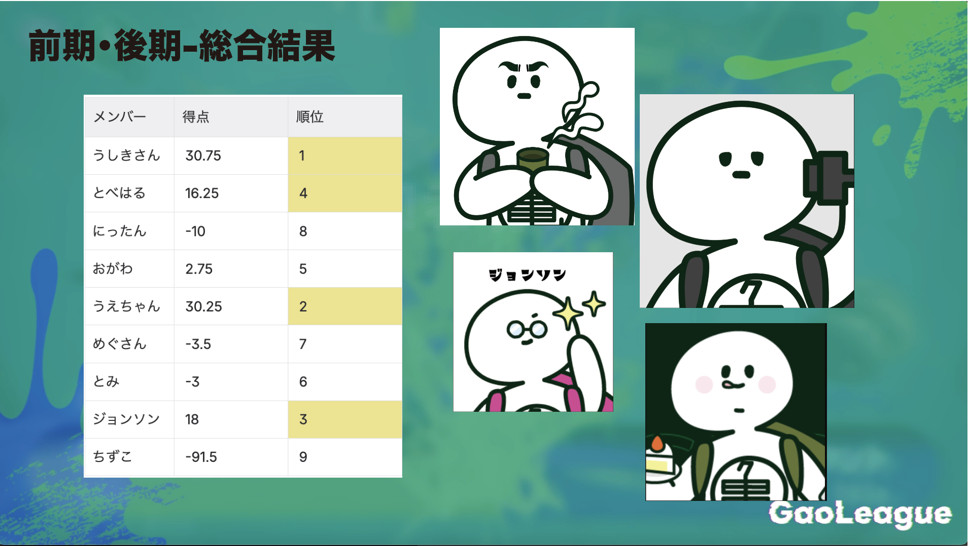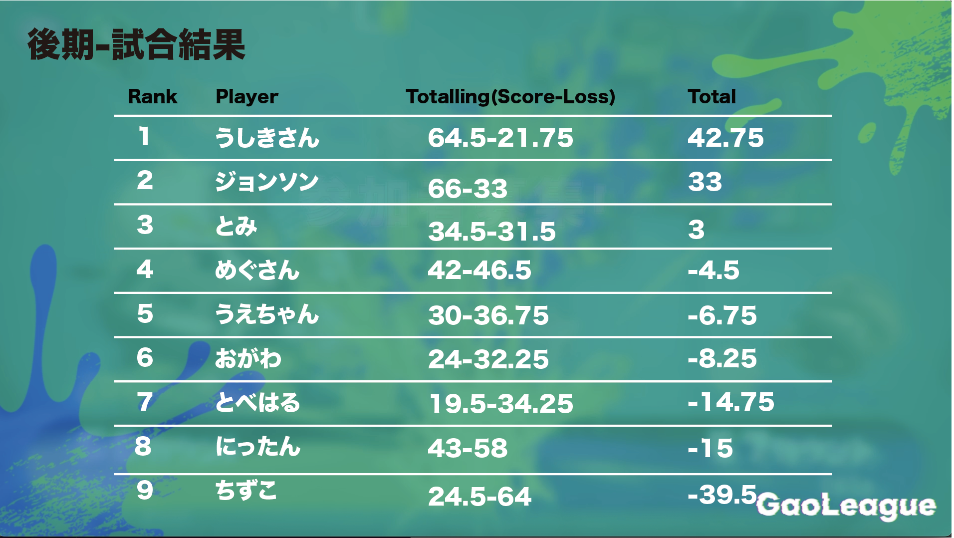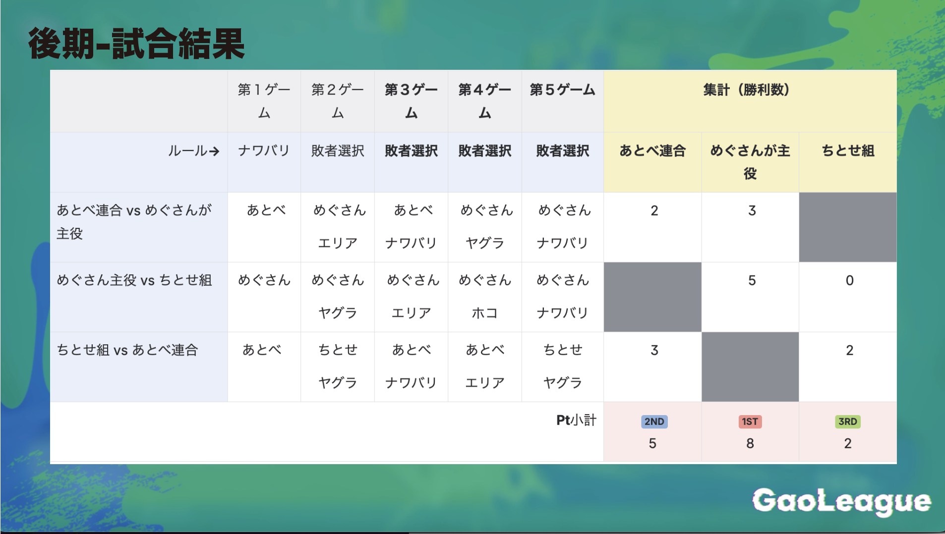 後期戦は2位の『あとべ連合』が繰り上げとなり、めぐさんが主役vsあとべ連合が熱戦を繰り広げました。